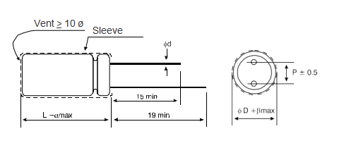 | * Vyššie uvedené špecifikácie musia byť splnené, keď sa kondenzátory obnovia 20 °C po privedení menovitého napätia s menovitým zvlneným prúdom pre 10,000 hod o hod 105 ° C | ||||||||
