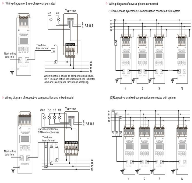 The product provides RS485 port, enkonstruita MODBUS-RTU protokolo, compatible with DL645-2007 protocol, able to perform remote monitoring and controlling. When more than one product connected with system, they will have one master machine among them automatically, others as slave machines, become automatic control system of reactive power compensation, any of individual one has fault, it will stop running, does not influence on others operating; if the master machine has fault and out of operation, they will produce new master machine automatically, form a new system.